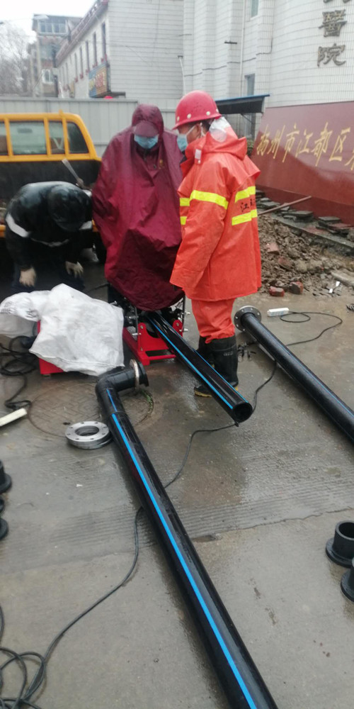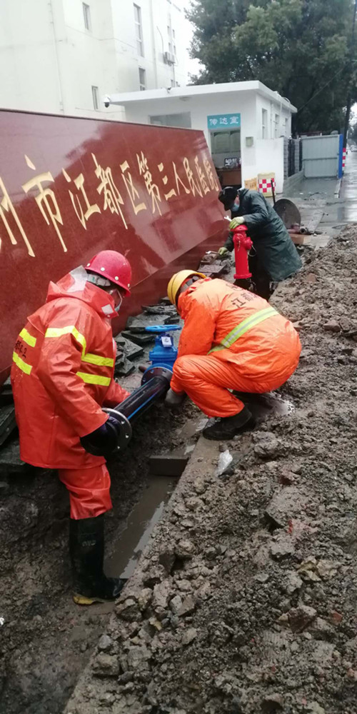 疫情就是命令,保供水就是責任。龍泉公司在接到緊急任務后,立即明確專人負責,成立施工突擊隊,并迅速派人赴區第三人民醫院擴建工程現場實地查勘,向院方詳細了解擴建工程供水需求、施工進度安排等,并與院方共同研究,現場確定擴建工程的接水方案。2月15日上午,搶修人員佩戴口罩、安全帽,進行了體溫測量,冒著雨雪趕赴現場,投入到緊張的施工工作中,由于前期施工方案細致、工作準備充分,經過10個小時的奮戰,于當天晚上8點順利完成了自來水管道的擴建安裝任務。