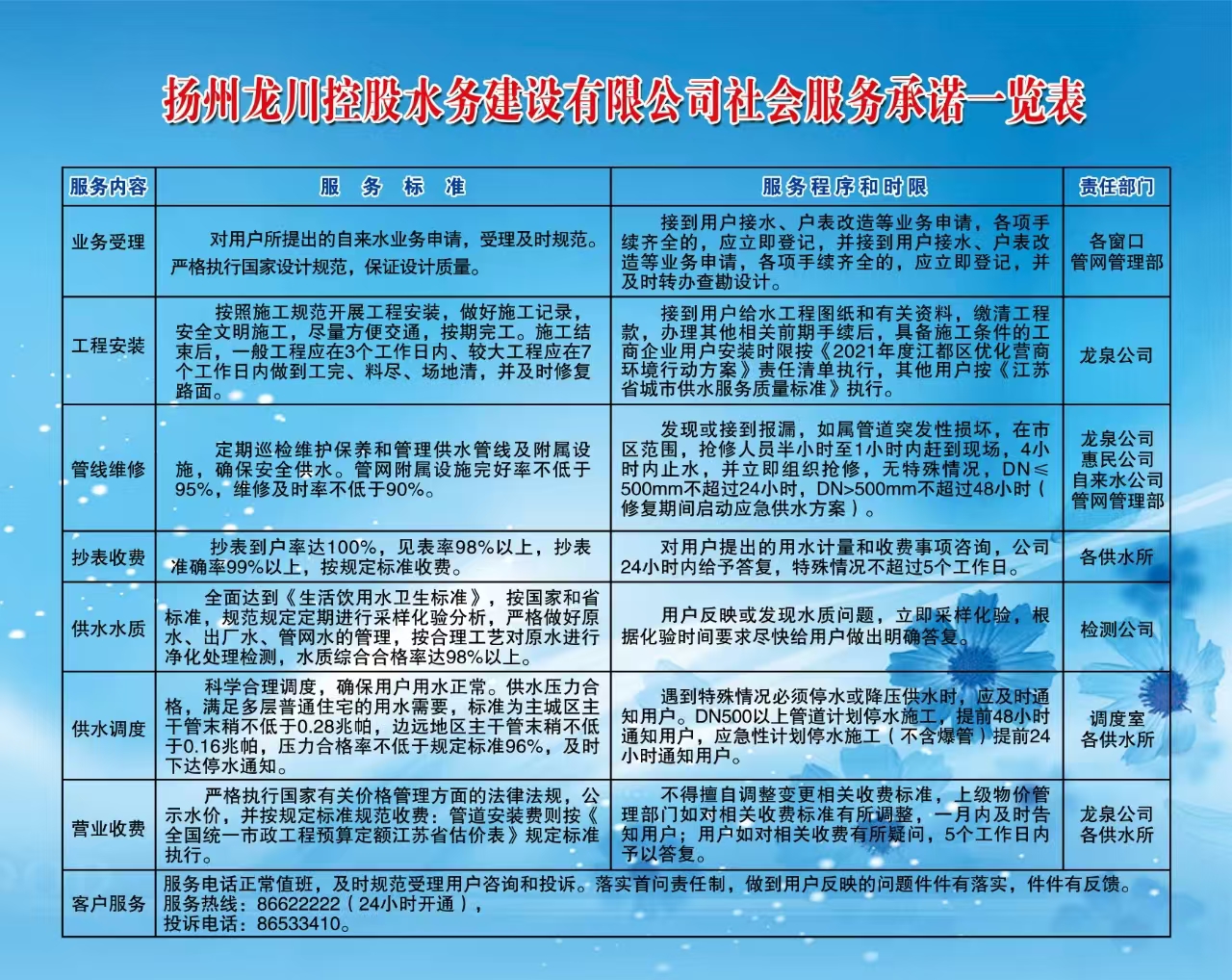 揚(yáng)州龍川控股水務(wù)建設(shè)有限公司社會(huì)服務(wù)承諾一覽表