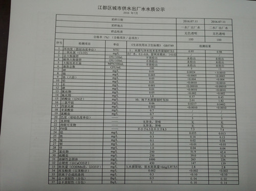 2016年7月江都區城市供水出廠水水質公示