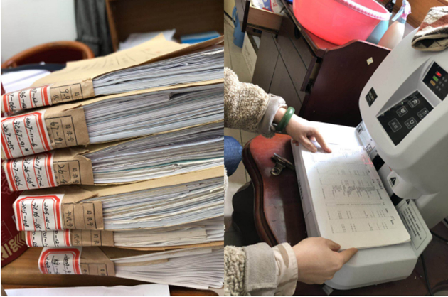 圖為財務檔案整理現(xiàn)場及其所展示的相關工作流程
