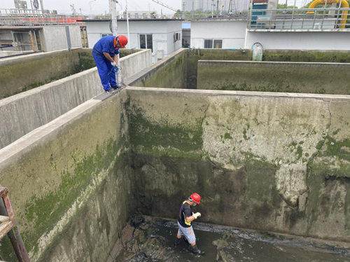 現(xiàn)場(chǎng)工作人員面對(duì)高溫天氣,佩戴好安全防護(hù)用品,深入貯水池及消毒池池底,不怕臟、不怕累,共同清理青苔、污泥,經(jīng)過一天的不懈努力,順利完成清淤工作。此次池組清淤工作組織得力,安全有序開展,確保了污水池組的正常運(yùn)行,保證出水水質(zhì)穩(wěn)定達(dá)標(biāo)排放。