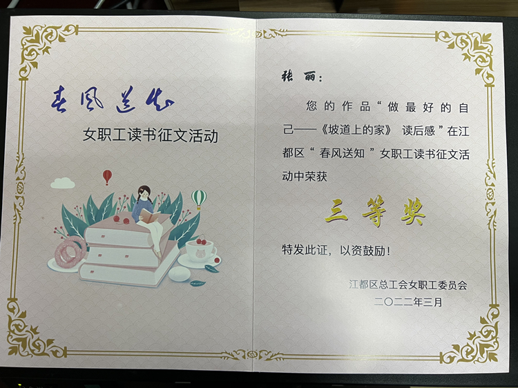 為全面提升員工綜合素質(zhì),倡導(dǎo)終身學(xué)習理念,豐富精神生活,引領(lǐng)職業(yè)女性愛上閱讀,培養(yǎng)閱讀習慣,在閱讀中獲得幸福感,激勵女職工立足崗位,以最美的奮斗姿態(tài)砥礪前行。為此龍川水務(wù)公司除在內(nèi)部多形式的開展讀書比賽和讀書分享會等相關(guān)活動之外,還積極響應(yīng)上級讀書征文活動號召,鼓勵大家踴躍投稿參賽。日前,在揚州市江都區(qū)總工會開展的“春風送知”女職工讀書征文活動中,由龍川水務(wù)公司選送的人力資源部張麗的參賽作品“做最好的自己—《坡道上的家》讀后感”獲得了三等獎。