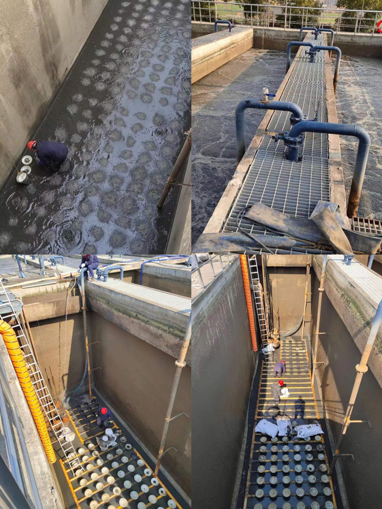圖為邵伯鎮(zhèn)污水廠曝氣盤維護(hù)換新施工現(xiàn)場。