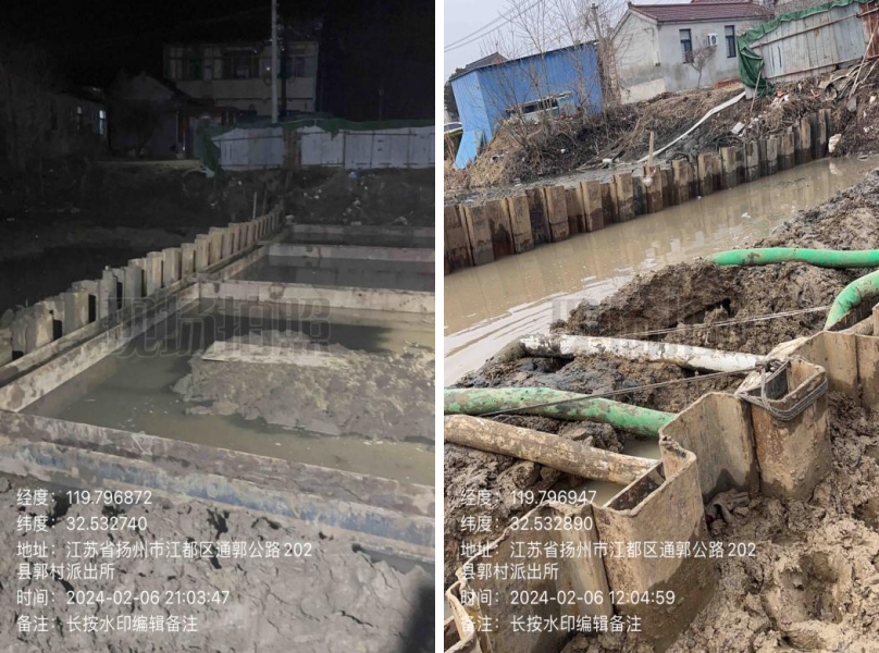 在施工過程中,東側(cè)原造橋壩頭設(shè)置過高,上游自來(lái)水漏水嚴(yán)重,挖機(jī)無(wú)法進(jìn)場(chǎng)施工,人工拆除兩道壩頭。施工總體步驟:草袋圍堰支護(hù),支護(hù)內(nèi)明排水,靜壓打樁,圍堰施工,開挖,管道維修,管道打壓,回填,鋼板樁拆除,圍堰拆除。
