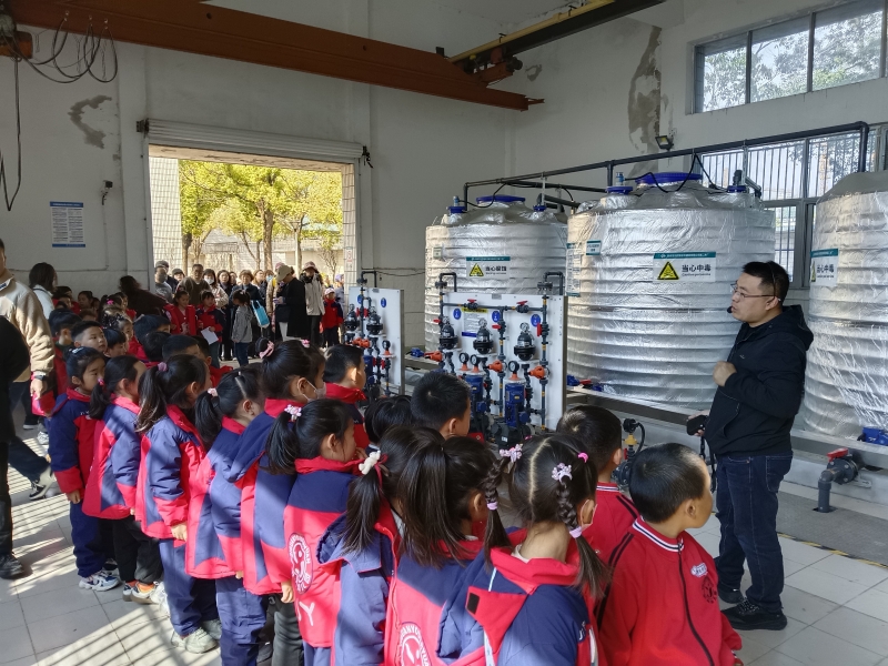 第二水廠廠長許明同志和葉欣大班長帶領小朋友們沿著水流的方向展開探索,生動有趣地向小朋友們介紹了水的處理流程,講解制水工藝。當看到渾濁的原水經過層層處理后變得清澈透明,小朋友們對河水變成自來水的過程有了一定的認知,讓小朋友們真真切切地感受到每一滴水的來之不易。