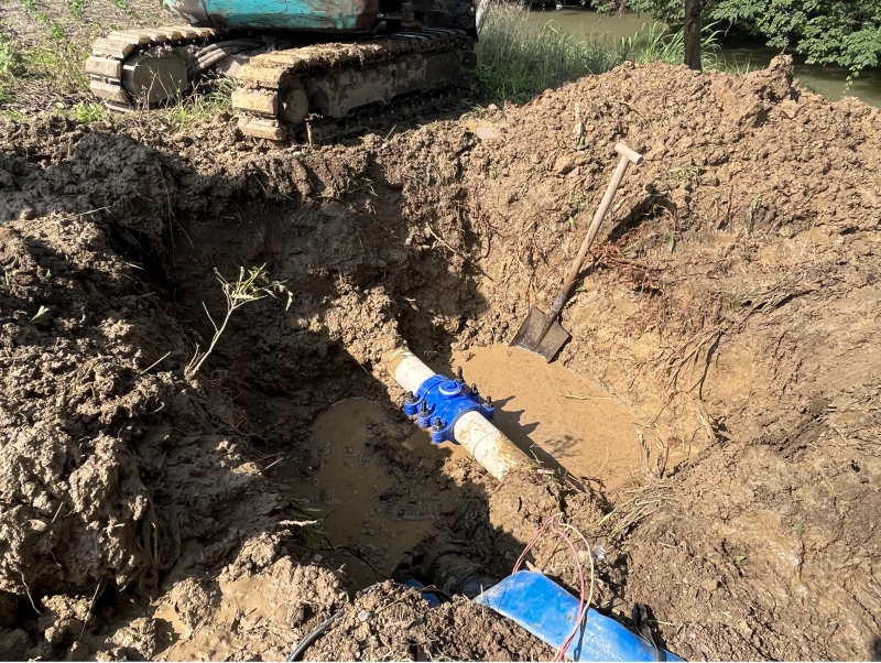 演練現場,此次搶修管道為DN110PVC管道,首先由維修人員關閉搶修點上下游閥門,在專人現場指揮下,機械挖掘組進行漏點挖掘。挖掘機設備運行良好,很快就將漏點挖出。漏點挖出后,使用水泵將坑中余水抽干。